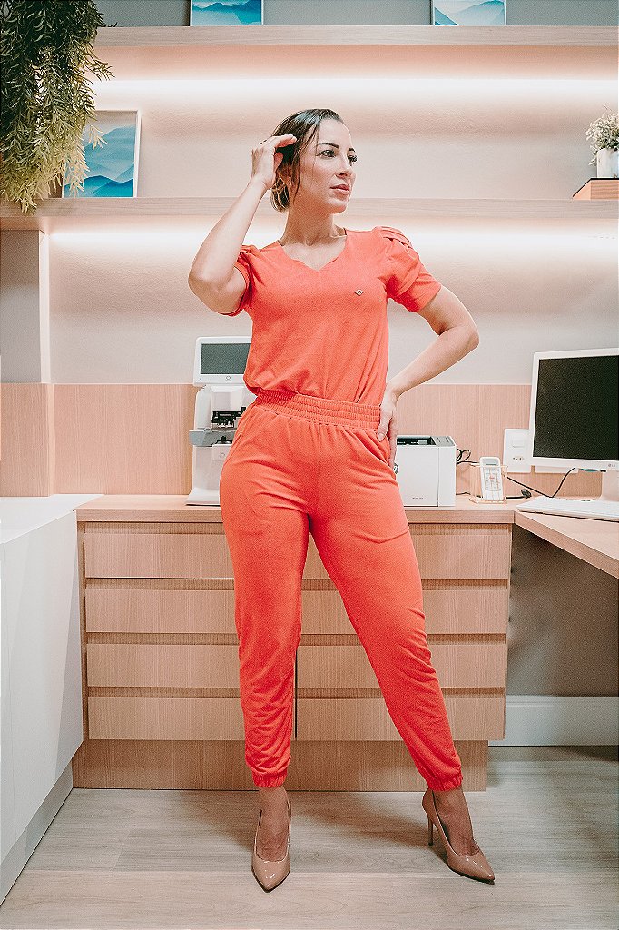 Apresenta blusa com manga tulipa e colo desenhado. A calça possui design descolado com elástico na cintura e nos tornozelos.